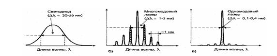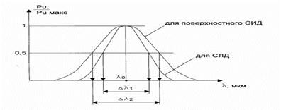 По спектральной характеристике можно определить ширину спектра излучения на уровне половинной от максимальной мощности излучения. Ширина спектра СЛД Δλ1 (10 ÷ 30 нм), для поверхностного СИД Δλ2 (30 ÷ 60 нм).