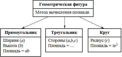 Итак, в большинстве случаев приведенные выше примеры являются крайне неудобными для представления такого рода данных. В этом случае используется так называемый объектно-ориентированный подход, реализованный в языке Паскаль при помощи типов объект и класс. Например, у рассмотренных выше объектов есть схожие черты: они являются геометрическими фигурами и для каждой из этих фигур известен алгоритм вычисления ее площади. Таким образом, структуру этих объектов можно представить при помощи следующей схемы: