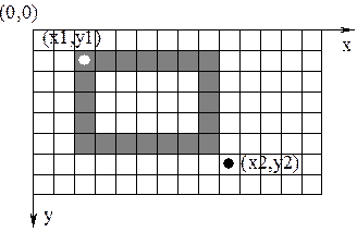 | Rectangle (x1, y1, x2, y2) | Рисование прямоугольника, левый верхний угол которого задается точкой (x1, y1), а правый нижний точкой (x2, y2). При этом внутренняя часть прямоугольника заполняется текущим цветом фона. На растровом изображении рисование прямоугольника происходит следующим образом: