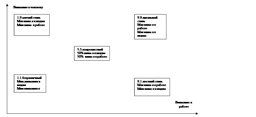 Б) ”Решетка менеджмента” Роберт Блейк и Джен С. Моутон – методика развития организации с точки зрения повышения квалификации менеджеров. Методика описана в их работе ”Психология поведения на предприятии”. Они создали оригинальный подход в оценке типологии менеджеров в целях их дальнейшего обучения. Зная свое место в решетке, каждый менеджер в состоянии оценить самого себя, более четко определить цели и повысить свою квалификацию. Таким образом, ”решетка менеджмента” имеет практическую направленность в целях улучшения работы менеджера. Авторы выделили 2 параметра – 2 силовые линии, на основании которых построена схема, представляющая 5 типов менеджеров. Каждый тип менеджера обозначен цифрами и выделено по 5 характерных управленческих стилей поведения.