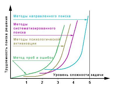Каждый из методов имеет целью облегчить поиск решения творческой задачи по сравнению, с так называемым, методом "проб и ошибок", которым обычно пользуется человек. Целесообразность применения метода, принадлежащего к той или иной группе, в частности, зависит от сложности решаемой задачи. На приведенном справа рисунке показаны для различных групп методов условные графики зависимости трудоемкости решения творческой задачи от ее сложности.