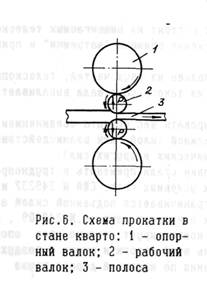 Диаметр валка прокатного стана определяет его прочность, но одновременно и энергосиловые параметры процесса прокатки. При этом увеличение диаметра валка влечет за собой повышение последних. В прокатном стане кварто (рис. 6) прочность валка "вынесена" из очага деформации полосы. Параметры процесса прокатки определяются размером рабочих валков, а прочность узла - размером опорных валков. На стане кварто с калиброванными валками можно прокатывать прутки и трубы (авт.св. N 113414).