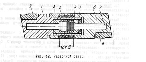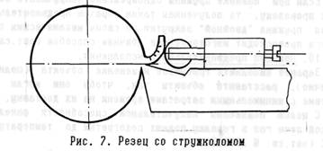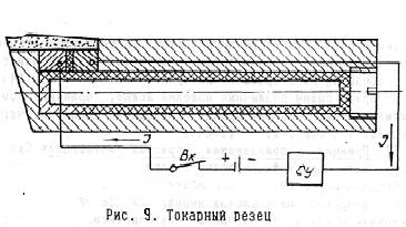 Для повышения стойкости ревущего инструмента токарный резец снабжен теплопроводимой прослойкой материала, выполненной в виде соединенных между собой полупроводниковых элементов разной проводимости, причем их холодный спай обращен к ревущей пластине (авт. N 1175612, рис. 9).