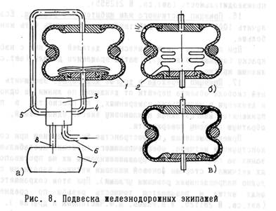 Принцип "заранее подложенной подушки" использован С.В.Никитиным, В.Й.Камаевым при разработке эластичной подвески для железнодорожных экипажей (рис. 8, авт.св. N 737254). Предложенная ими эластичная подвеска с пневматическими амортизаторами работает следующим образом. При выходе из строя (прорыве) основного пневмобаллона 1 давление в нем падает. Воздухораспределитель 3 перекрывает труборовод 5 и сообщает через трубопроводы 4 и 8 дополнительный резервуар 7 с дополнительным пневмобаллоном 2, и по трубопроводу 6 дополни тельный пневмобаллон 2 заполняется воздухом и плотно облегает изнутри основной баллон 1. При этом оболочка основного пневмобаллона 1 служит каркасом для дополнительного пневмобаллона 2.