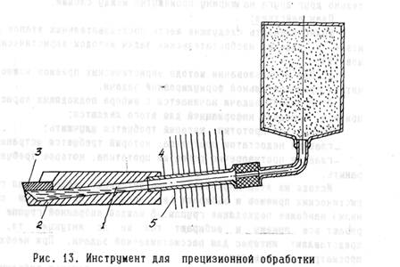 Знание приема - использование механических колебаний - позволило Э.В.Рыжову. В.И.Аверченкову и другим авторам предложить новый способ магнитнообразивной обработки изделий (авт.св. 751598). В этом изобретении, с целью повышения точности обработки и получения одинаковой шероховатости по длине обрабатываемой поверхности путем равномерного распределения ферропорошка, в процессе обработки необходимой дозе ферропорошка сообщают осциллирующие колебания вдоль обрабатываемой поверхности, причем момент сообщения колебаний ферропорошку опережает начало процесса обработки.
