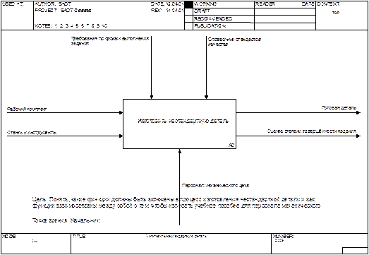 Это пример того, как SADT соединяет диаграммы в модели через объекты системы. Такая схема соединения требует согласованного наименования и учета объектов системы с тем, чтобы две диаграммы можно было рассматривать как связанные между собой. Например, функциональный блок на верхней диаграмме имеет семь дуг, и каждая из них может быть найдена среди дуг, идущих к границе или от границы диаграммы на следующем уровне.