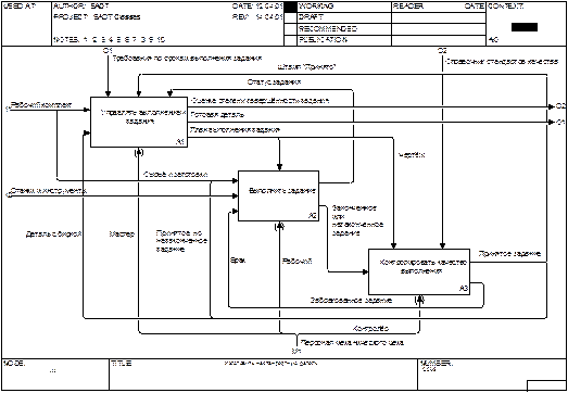 Каждое из таких тщательно взаимосогласованных описаний называется диаграммой. SADT-модель объединяет и организует диаграммы в иерархические структуры, в которых диаграммы наверху модели менее детализированы, чем диаграммы нижних уровней. Другими словами, модель SADT можно представить в виде древовидной структуры диаграмм, где верхняя диаграмма является наиболее общей, а самые нижние наиболее детализированы. На рис. 1-2 представлены две диаграммы из модели экспериментального механического цеха. Верхняя диаграмма (на вершине модели) описывает механический цех как функцию, в основе которой лежит преобразование входящих рабочих комплектов (заготовок, сырья, документации) в детали при определенном контроле качества. Нижняя диаграмма детализирует верхнюю, указывая на три главные функции механического цеха: управление выполнением заданий, выполнение задания и контроль качества выполнения. Таким образом, общая функция, указанная на верхней диаграмме, детализируется с помощью трех функций на нижней диаграмме это пример того, как SADT организует описание системы, создавая иерархию добавляющихся на каждом уровне деталей.