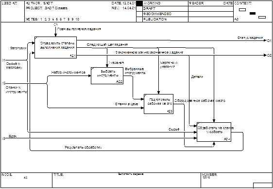 Каждая SADT-диаграмма содержит блоки и дуги. Блоки изображают функции моделируемой системы. Дуги связывают блоки вместе и отображают взаимодействия и взаимосвязи между ними (рис.2-1). Диаграмме дается название, которое располагается в центре нижней части ее бланка. На каждой диаграмме написана стандартно идентифицирующая ее информация: автор диаграммы, частью какого проекта является работа, дата создания или последнего пересмотра диаграммы, статус диаграммы. Вся идентифицирующая информация располагается в верхней части бланка диаграммы.