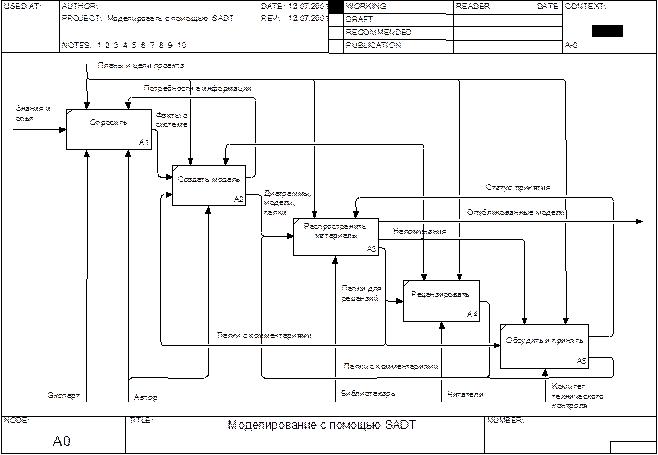 В процессе моделирования сведения об изучаемой системе получают с помощью испытанной методики сбора информации - опросов или интервью. Для получения наиболее полной информации SADT предлагает использовать различные ее источники (например, читать документы, опрашивать людей, наблюдать за работой системы). Независимо от конкретного источника информации методология SADT рекомендует руководствоваться определенной целью при его использовании. Это означает, что вы должны определить свои потребности в информации прежде, чем выбрать очередной источник. Во время опроса графический язык SADT используется как средство для заметок, которые служат основой для построения диаграмм. Процесс опроса подробно описан в главе 7.