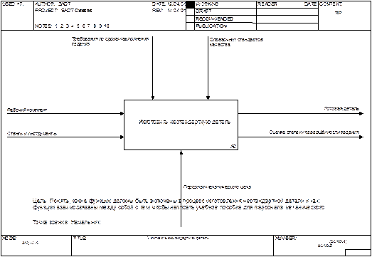 «Экспериментальный механический цех производит нестандартные детали. Он делает это, используя рабочий комплект и станки и инструменты с помощью процесса, управляемого справочником стандартов качества и создающего готовую деталь. Кроме того, поступающие время от времени требования по срокам выполнения задания, требуют отчета об оценке степени завершённости задания».