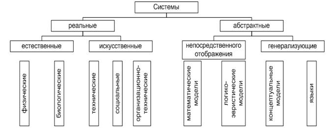 Абстрактные системы разделяют на системы непосредственного отображения (отражающие определенные аспекты реальных систем) и системы генерализирующего (обобщающего) отображения. К первым относятся математические и эвристические модели, а ко вторым — концептуальные системы (теории методологического построения) и языки.