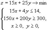 Суточное питание этими продуктами должно давать не более 14 единиц жира (чтобы похудеть), но не менее 300 калорий. На упаковке продукта Р написано, что в одном килограмме этого продукта содержится 15 единиц жира и 150 калорий, а на упаковке с продуктом Q - 4 единицы жира и 200 калорий соответственно. При этом цена 1 килограмма продукта Р равна 15 руб., а 1 кг продукта Q - 25 руб.