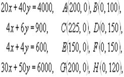 Для того, чтобы найти в первой четверти плоскости хОу множество точек, координаты (х, у) которых удовлетворяют указанным выше неравенствам, необходимо сначала построить прямые (по точкам их пересечения с координатными осями)