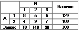 Пример 2. Компания имеет два товарных склада и трех оптовых покупателей. Известно, что общий объем запасов на складах составляет 300 тыс. единиц продукции и совпадает с общим объемом заказов покупателей.