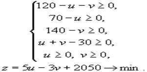 Выписанные неравенства определяют на плоскости (u, v) пятиугольник с вершинами (30, 0), (70, 0), (70, 50), (0, 120), (0, 30).