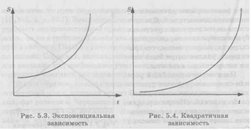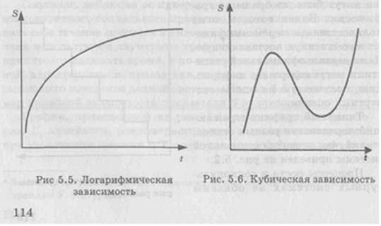 Процессы роста в социокультурных системах не обязаныподчиняться только линейной зависимости. Траектория роста может описываться экспоненциальной кривой типа е (рис. 5.3), квадратичной кривой (рис. 5.4). Значительно более медленный рост показателя S часто отражает логарифмическая траектория (рис. 5.5). Конечно, значение показателя не всегда монотонно возрастает. В ходе процесса возможен и кратковременный спад. На рис. 5.6 изображена кубическая модель подобной траектории (S(t) = а/ + а/+ + а,* + U4).