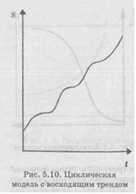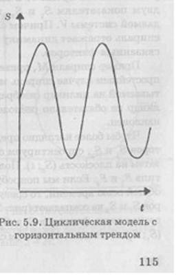 Как уже говорилось, наиболее популярной формой социокультурных процессов являемся прямая линия, отражающая линейные представления о ходе социального времени. Однако мыслителей всех времен привлекали также циклическая модель социального времени, предполагающая периодическое повторение определенных фаз развития, рекуррентное возвращение к исходному возвращению к исходному состоянию. Простейшая траектория циклического типа в виде синусоидальной кривой с горизонтальным трендом приведена на рис. 5.9, а с линейно возрастающим трендом – на рис. 5.10. Циклическая траектория количественной переменной не обязательно точно соответствует графику математической синусоиды – период и амплитуда колебаний могут со временем меняться[7].
