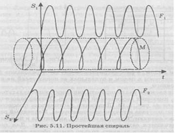 Естественно, говорить о точном следовании синусоиде в случае качественной переменной просто неуместно. Именно качественные переменные, как правило, имеют в виду, рассматривая развитие процесса по спирали. Известно, что образ спирали обладает большой генеративной силой, весьма способствует инсайту, благодаря чему довольно часто фигурирует в трудах обществоведов в качестве одной из базовых метафор социальных изменений. Как геометрический объект спираль изображается в трехмерном пространстве, одной координатой которого является время t, а две другие координаты соответствуют двум показателям S1 и S2, характеризующим эволюцию наблюдаемой системы V. Причем следует обязательно учитывать то, что спираль отражает динамику взаимодействия именно двух взаимосвязанных факторов[8].