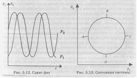 Чтобы более наглядно представить ход изменения значений факторов S1 и S2, спроектируем спираль сначала на плоскость (S1; t), a затем на плоскость (S2; t). Получим две траектории синусоидального типа F1 и F2. Если мы попробуем изобразить их на одном графике с общей осью времени, то сразу заметим, что фазы колебаний факторов S1 и S2 не совпадают (рис. 5.12). Чтобы наглядно представить себе взаимосвязь факторов S1 и S2, спроектируем спираль на плоскость (S1; S2). Очевидно, что в этом случае получим круг, изображенный на рис. 5.13.