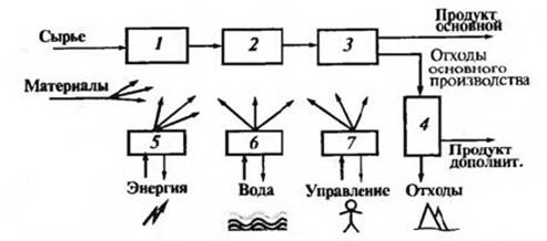 Рис. 1.1. Структура и функциональные элементы химического производства: 1 - подготовка сырья; 2 - переработка сырья; 3 - выделение основного продукта; 4 - санитарная очистка и утилизация отходов; 5 - энергетическая система; 6 – подготовка вспомогательных материалов и водоподготовка; 7 - система управления