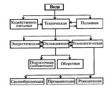 Технологическая вода подразделяется в свою очередь на средообразующую, промывающую и реакционную. Средообразующая вода используется для растворения и образования пульп (суспензий) при обогащении, гидротранспорте продуктов и отходов производства; промывающая вода - для промывки газообразных (абсорбция), жидких (экстракция) и твердых продуктов; реакционная - в качестве реагента, а также при азеотропной отгонке. Технологическая вода непосредственно контактирует с продуктами процесса.