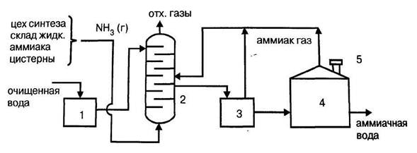 Рис. 4.11. – производство аммиачной воды. 1 – сборник очищенной воды; 2 – колонная абсорбции; 3 – промежуточный сборник; 4 – хранилище аммиачной воды; 5 – предохранительный клапан.