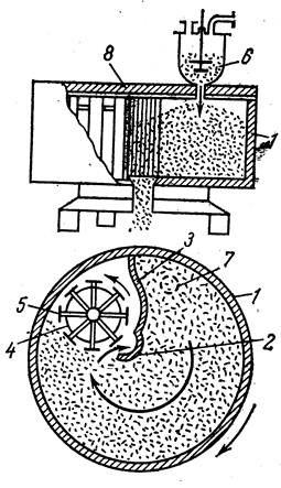 Рис. 6.3 Суперфосфатная камера непрерывного действия (вертикальный и горизонтальный разрезы): 1 - корпус камеры; 2 - полуцилиндр; 3 - неподвижный щит; 4 - карусель-фрезер; 5 - ножи; 6 - смеситель; 7 - место поступления пульпы; 8 - неподвижная крышка.