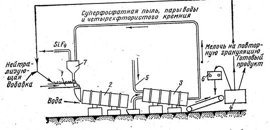 Рис. 6.4. Схема установки нейтрализации и гранулирования суперфосфата: 1 - ленточный транспортёр, подающий суперфосфат; 2 - гранулятор; 3 - барабанная сушилка; 4 - грохот; 5 - подвод горячего воздуха; 6 - валковая дробилка; 7 - циклон.