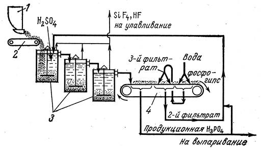 Рис. 6.5 Схема производства фосфорной кислоты экстракционным способом: 1 - бункер; 2 - ленточный весовой дозатор; 3 - экстракторы; 4 - ленточный вакуум-фильтр.