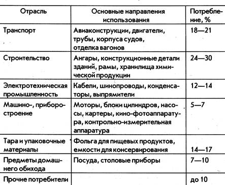 Вследствие комплекса ценных свойств (малая плотность, пластичность, высокие тепло- и электропроводность, нетоксичность, немагнитность, коррозийная стойкость к атмосфере), а также недефицитности сырья и относительно низкой стоимости алюминий в чистом виде и в сплавах широко применяется в различных отраслях техники: