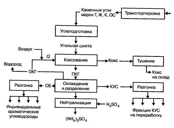 4) Перерабатывающие цехи (коксовый, смолоперегонный, ректификации и другие), в которых химические продукты, поступающие из цеха улавливания, подвергаются дальнейшей переработке. Готовой продукцией этих цехов являются индивидуальные ароматические углеводороды, нафталин, фталевый ангидрид, фенолы и пиридиновые основания, пек, пековый кокс и другие.
