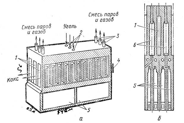 Рис. 12.5. Коксовая печь (коксовая батарея): а – разрез по обогревательному простенку; б – поперечный разрез камеры: 1 - камеры; 2 - загрузочные люки; 3 - стояки для отвода газа; 4 – коксовыталкиватель; 5 - регенераторы; 6 - обогревательный простенок