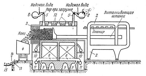 Рис. 12.7. Схема выгрузки коксового пирога: 1 – отверстие для загрузки угля; 2 - кокосовыталкиватель; 3 - направляющая рама; 4 - тушильный вагон; 5 – стояки; 6 – газосборники; 7 – регенераторы; 8 – подовый канал; 9 – борова; 10 – газопроводы коксового газа; 11 – газопроводы доменного газа; 12 – перекидные каналы; 13 – рампа; 14 – задвижка; 15 – транспортёр для кокса.