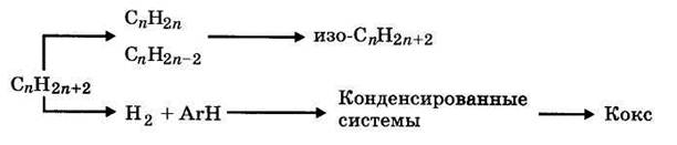 Важнейшим направлением превращений при каталитическом крекинге являются реакции алканов, которые подвергаются реакциям деструкции и изомеризации. Последовательность реакций алканов на алюмосиликатном катализаторе может быть представлена в следующем виде.