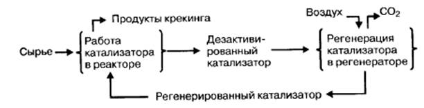 Перераспределение водорода в процессе каталитического крекинга вызывает отложение кокса на поверхности катализатора, что достигается выжиганием кокса в токе воздуха. Поэтому, работа катализатора при крекинге складывается из двух последовательных стадий: рабочего процесса в реакторе и восстановления активности в регенераторе (регенерация), как показано на рис. 13.7.