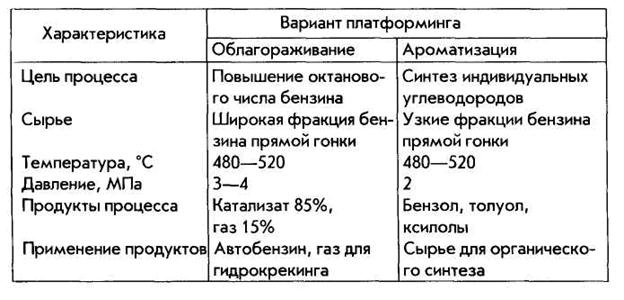 — облагораживание бензина — получение бензина с высоким содержанием ароматических углеводородов и высоким ОЧ.