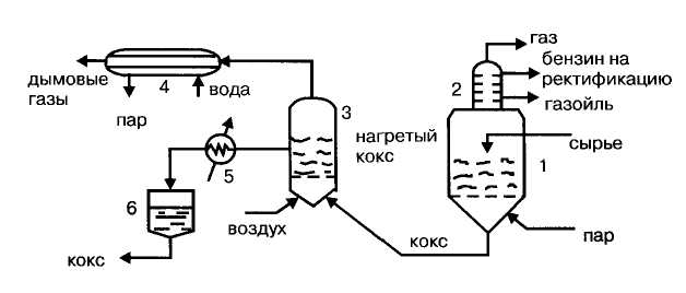 Жидкое сырье подается в реактор 1, в котором поступающим снизу водяным паром создается кипящий слой кокса. Парогазовая смесь продуктов коксования поступает в парциальный конденсатор реактора 2, где разделяется на газ, бензиновый дистиллят, направляемый на ректификацию, и газойль. Коксовый теплоноситель из реактора подается в коксонагреватель 3, где частично сжигается в токе воздуха. Нагретый кокс охлаждается в коксовом холодильнике 5 и поступает в бункер кокса 6, а частично возвращается в реактор 1. Дымовые газы из коксонагревателя 3 проходят котел-утилизатор 4 и выбрасываются в атмосферу.