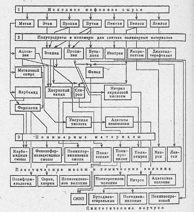 Исходные вещества — простые углеводороды: метан, этилен. пропилен, бутилен, ацетилен, бензол толуол и др., являются основным сырьем органического синтеза, получаются при химической переработке газообразных, жидких и твердых видов топлива. Раньше основным источником сырья органического синтеза была смола коксования и полукоксования. Широко использовалось сырье растительного и животного происхождения. В последние годы преобладающее значение приобрели жидкие углеводороды нефти, природный и попутные газы, а также газы нефтепереработки.
