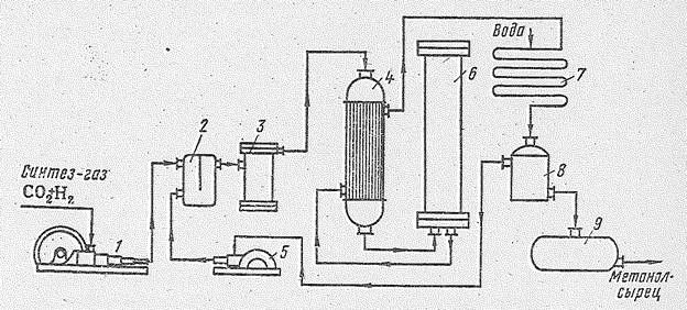 Рис. 14.2. Схема установки для синтеза метилового спирта из оксида углерода и водорода: 1 - компрессор; 2 - смеситель; 3 - фильтр; 4 - трубчатий теплообменник; 5 - циркуляционный компрессор; 6 колонна синтеза; 7 - холодильник-конденсатор; 8 – сепаратор; 9 - сборник спирта-сырца.