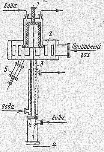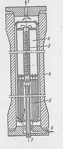![]() | Рис. 14.7. Реактор для электрокрекинга: 1- катод; 2 -реакционная камера; 3 - заземленный анод; 4 - вывод газов крекинга; 5 - пусковой электрод. |