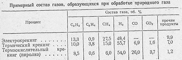 Установлено, что при подаче бензина в зону закалки при окислительном пиролизе метана можно значительно увеличить выход ацетилена; этилена и синтез-газа. Так как метод пиролиза и состав исходного сырья в значительной степени влияют на состав конечного газа, схемы выделения ацетилена могут сильно отличаться друг от друга.