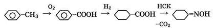 2. Из толуола через бензойную кислоту с последующим гидрированием ее до циклогексанкарбоновой кислоты и обработкой последней нитрозилсерной кислотой (толуольный метод):