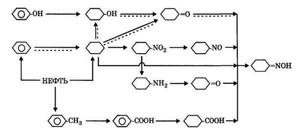 Рис. 14.10. Взаимосвязь промышленных методов производства циклогексаноноксима из различного сырья