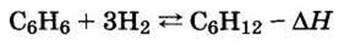 1. Гидрирование бензола до циклогексана протекает над никелевым катализатором на носителе оксиде хрома (III) при температуре 130—220 °С и давлении 1 МПа: