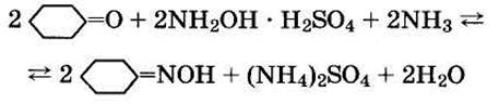 4. Оксимирование циклогексанона до циклогексаноноксима протекает в избытке водного раствора сульфата гидроксиламина и в присутствии аммиака или щелочи при температуре от 0 °С до 100 °С