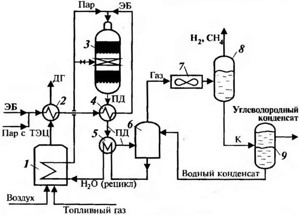 Рис. 14.13. Схема дегидрирования этилбензола в стирол: 1 - пароперегревательная печь; 2 - испаритель этилбензола; 3 - реактор дегидрирования; 4 - подогреватель этилбензола; 5 - подогреватель воды; б - пенный аппарат; 7 - воздушный холодильник; 8- сепаратор; 9 - разделитель фаз. Потоки: ЭБ - этилбензол (свежий рецикл); Н2, СН4 - горючие газы в топливную сеть; ДГ - дымовые газы; К - конденсат; ПД - продукты дегидрирования.