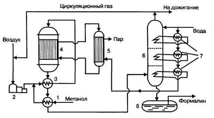 Метанол испаряется в теплообменнике 1, обогреваемом реакционной смесью, смешивается с воздухом, нагнетаемым турбокомпрессором 2 и через теплообменник 3 подается в реактор 4. Съем тепла и тепловой режим в реакторе обеспечивается хладоагентом, циркулирующим через котел-утилизатор 5. Реакционная смесь, выходящая из реактора 4, охлаждается в теплообменниках 3 и 1 и поступает в абсорбер 6, орошаемый водой. Тепло абсорбции отводится и утилизируется в выносных теплообменниках 7, подогревающих обессоленную воду, подаваемую на абсорбцию и питающую котел-утилизатор 5, вырабатывающий технологический пар. Образующийся формалин выводится из нижней части абсорбера и поступает в сборник 8. Часть отходящих из верхней части абсорбера 6 газов смешивается с воздухом перед входом его в реактор для снижения взрывоопасности смеси воздуха с парами метанола, а остальное количество их направляется в печь для дожигания (на схеме не указана) и выбрасывается в атмосферу. Производство формальдегида по этой схеме работает по замкнутому циклу и в нем отсутствуют отходы, сточные воды и вредные газовые выбросы.