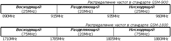 Передача данных осуществляется по радиоканалам. Сеть GSM работает в диапазонах частот 900 или 1800 МГц. Более конкретно, например, в случае рассмотрения диапазона 900МГц подвижной абонентский аппарат передает на одной из частот, лежащих в диапазоне 890-915 МГц, а принимает на частоте, лежащей в диапазоне 935-960 МГц. Для других частот принцип тот же, изменяются только численные характеристики.