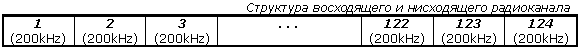 По аналогии со спутниковыми каналами направление передачи от абонентского аппарата к базовой станции называется восходящим (Rise), а направление от базовой станции к абонентскому аппарату - нисходящим (Fall). В дуплексном канале, состоящем из восходящего и нисходящего направлений передачи, для каждого из названных направлений применяются частоты, различающиеся точно на 45МГц. В каждом из указанных выше частотных диапазонов создаются по 124 радиоканала (124 для приема и 124 для передачи данных, разнесенных на 45МГц) шириной по 200кГц каждый. Этим каналам присваиваются номера (N) от 0 до 123. Тогда частоты восходящего (FR) и нисходящего (FF) направлений каждого из каналов можно вычислить по формулам: FR(N) = 890+0.2N (МГц), FF(N) = FR(N) + 45 (МГц).