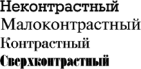 Контрастность – отношение толщины соединительных штрихов знака, к толщине основных штрихов. Штрих может быть неконтрастным, малоконтрастным, контрастным и сверхконтрастным.